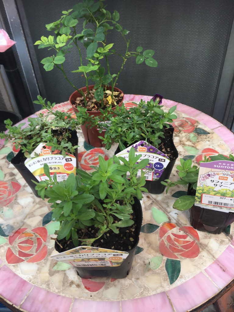 今ある花たちは、ピンク系が多いので、黄色、オレンジ、青を買ってみました。