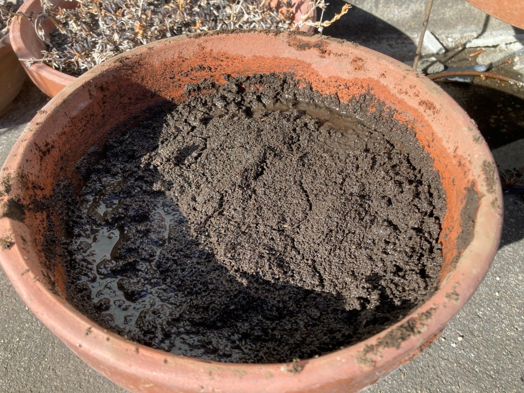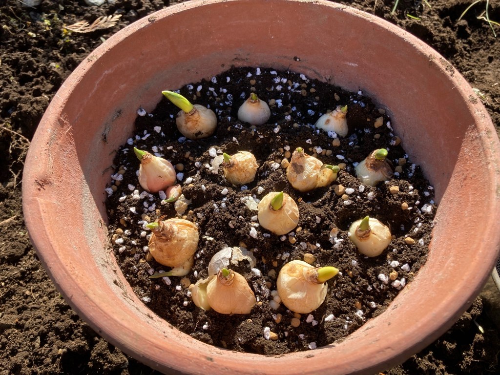 培養土がなかったので、庭の土をふるい、赤玉土とパーライトを混ぜて球根を並べて、土をかぶせて水をかけると