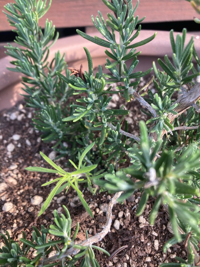 鉢植えのローズマリーの横から伸びた芽。