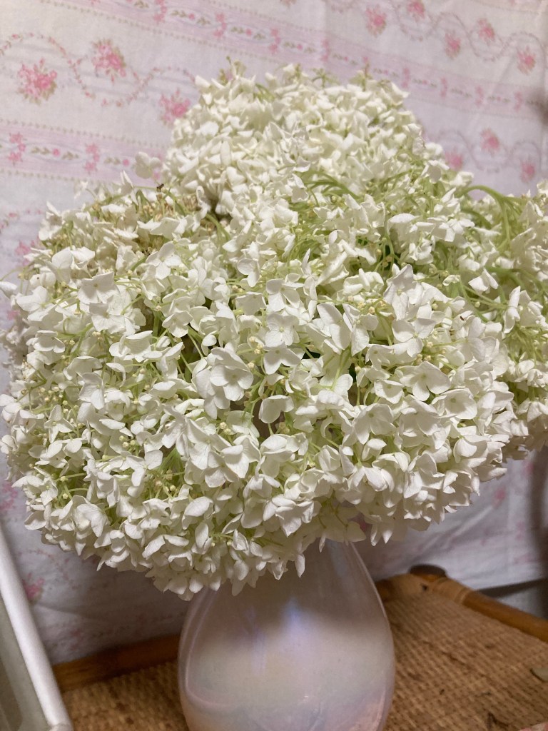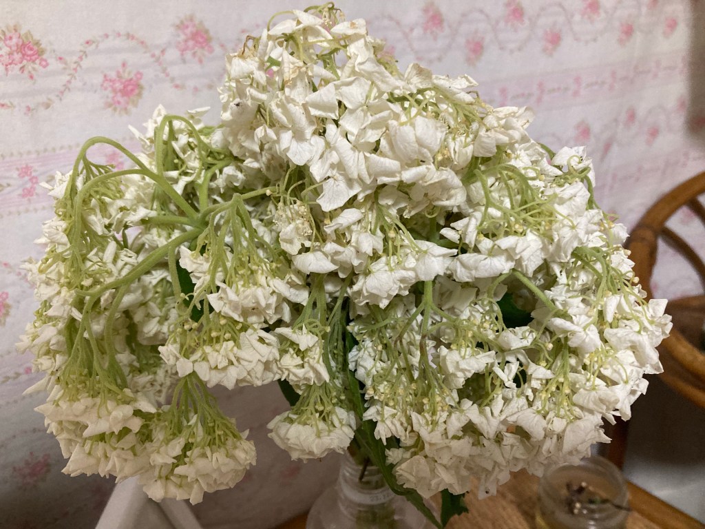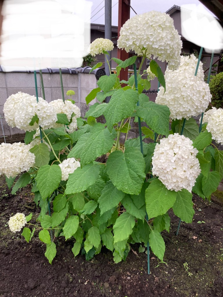 雨の重さで割れたアナベル。