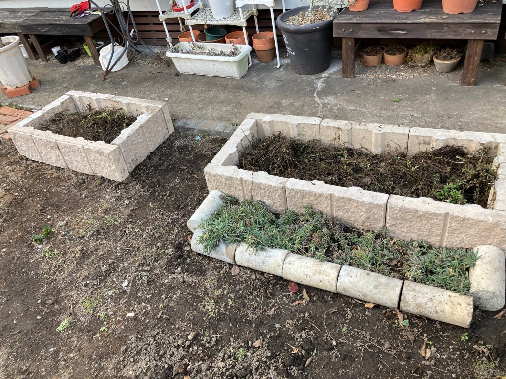大の手前には、持っていたコンクリートの円柱で低めの花壇も増設。