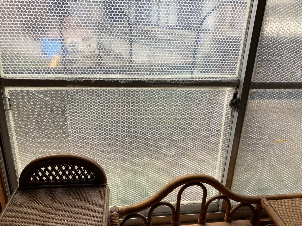 去年は窓にプチプチを貼り、防寒。