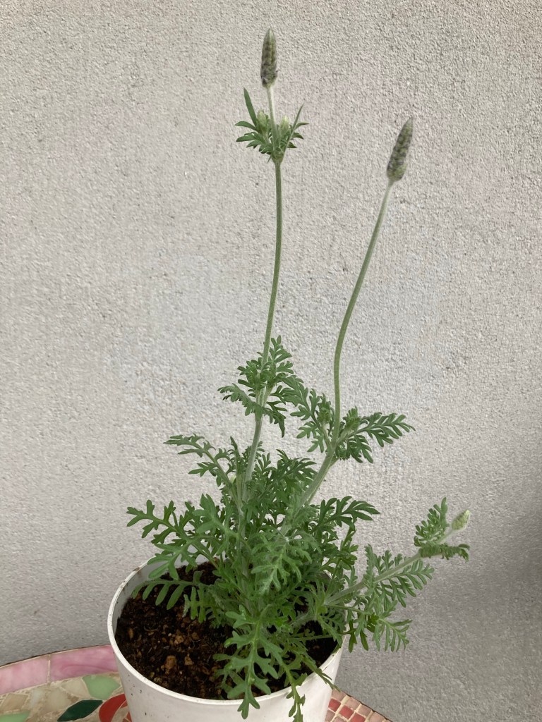 土曜に買って、日曜に鉢植えにしたレースラベンダーです。