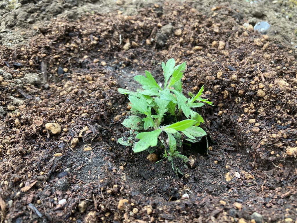 硬く踏み固められた場所で、掘ってみるとほんの数センチで砂利の層にあたる。ちょっとだけ頑張って掘り、市販の培養土を入れたものの、周囲はまだまだ硬いまま。