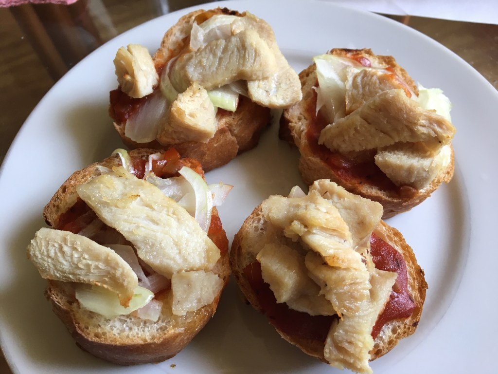バゲットにピザソース塗って、玉ねぎのスライスとチンした鳥の胸肉とバターを乗せて、トースターで焼きました。